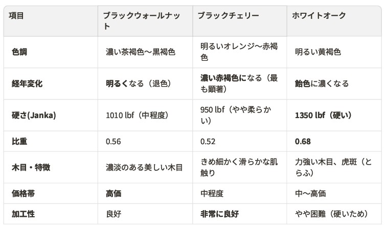家具や内装材を選ぶとき、多くの人が一度は憧れ、そして比較検討するのが「ウォールナット」「チェリー」「ホワイトオーク」の3つの木材ではないでしょうか。これらは「世界三大銘木」の一角であるウォールナットを筆頭に、それぞれが持つ独特の美しさ、堅牢さ、そして物語性で、古くから世界中で愛されてきました。
